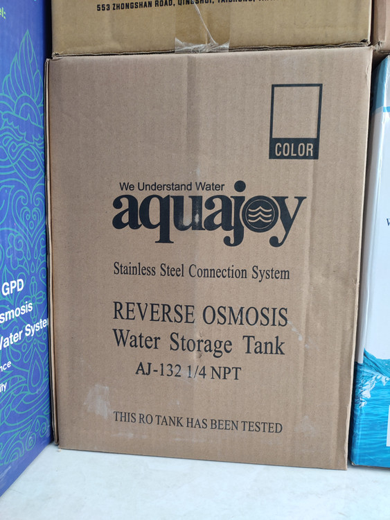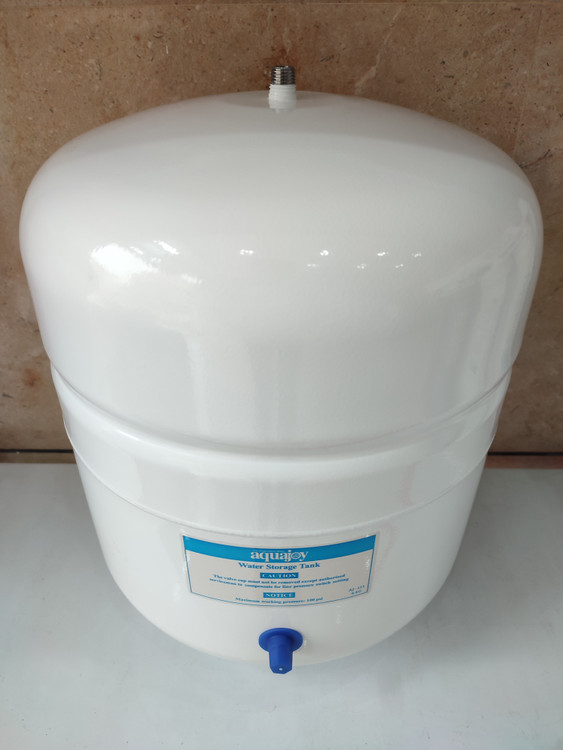 مخزن فلزی دستگاه تصفیه آب آکواجوی یک مخزن ذخیره ی آب تحت فشار از جنس فلز با لایه داخلی پلاستیک فود گرید A+ ساختهشده. ظرفیت اسمی این مخزن 4.4 گالن یا 17 لیتر است که توانایی ذخیره 12 لیتر آب را دارد. این مخزن از نوع تحت فشار و دارای دیاگرافم هوای فشردهاست که به خروج آب با فشار بالا کمک می کند.