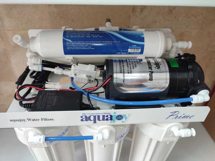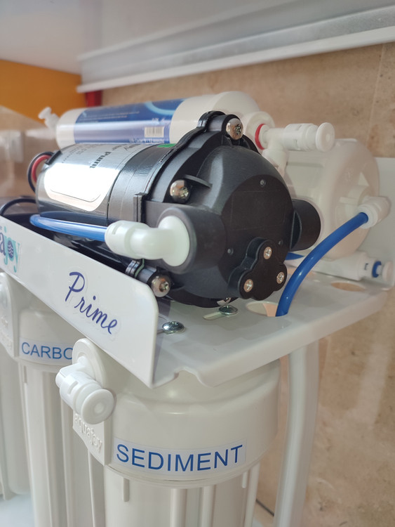انواع آب شیرین کن خانگی برای تصفیه آب و تامین فشار لازم جهت عبور آب از غشای فوق ریز ممبران، نیاز به یک پمپ دارند. پمپ استفاده شده در آب شیرین کن آکواجوی مدل پریم، قادر است 116 تا 145 PSI فشار آب را بالا برده تا ممبران به راحتی آب را تصفیه کرده و دچار مشکل نشود. پمپ تصفیه آب آکواجوی دارای ولتاژ 240 ولت و حداکثر نرخ جریان 417 گالن در روز است.