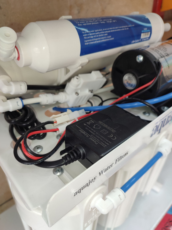 دستگاه تصفیه آب AQUAJOY مدل PRIME برای تامین برق کلیه قطعات برقی سیستم از جمله پمپ، شیر برقی، سوئیچ فشار پایین (سنسور LP) و سوئیچ فشار بالا (سنسور HP) دارای یک آداپتور سوئیچینگ 24 ولت است.